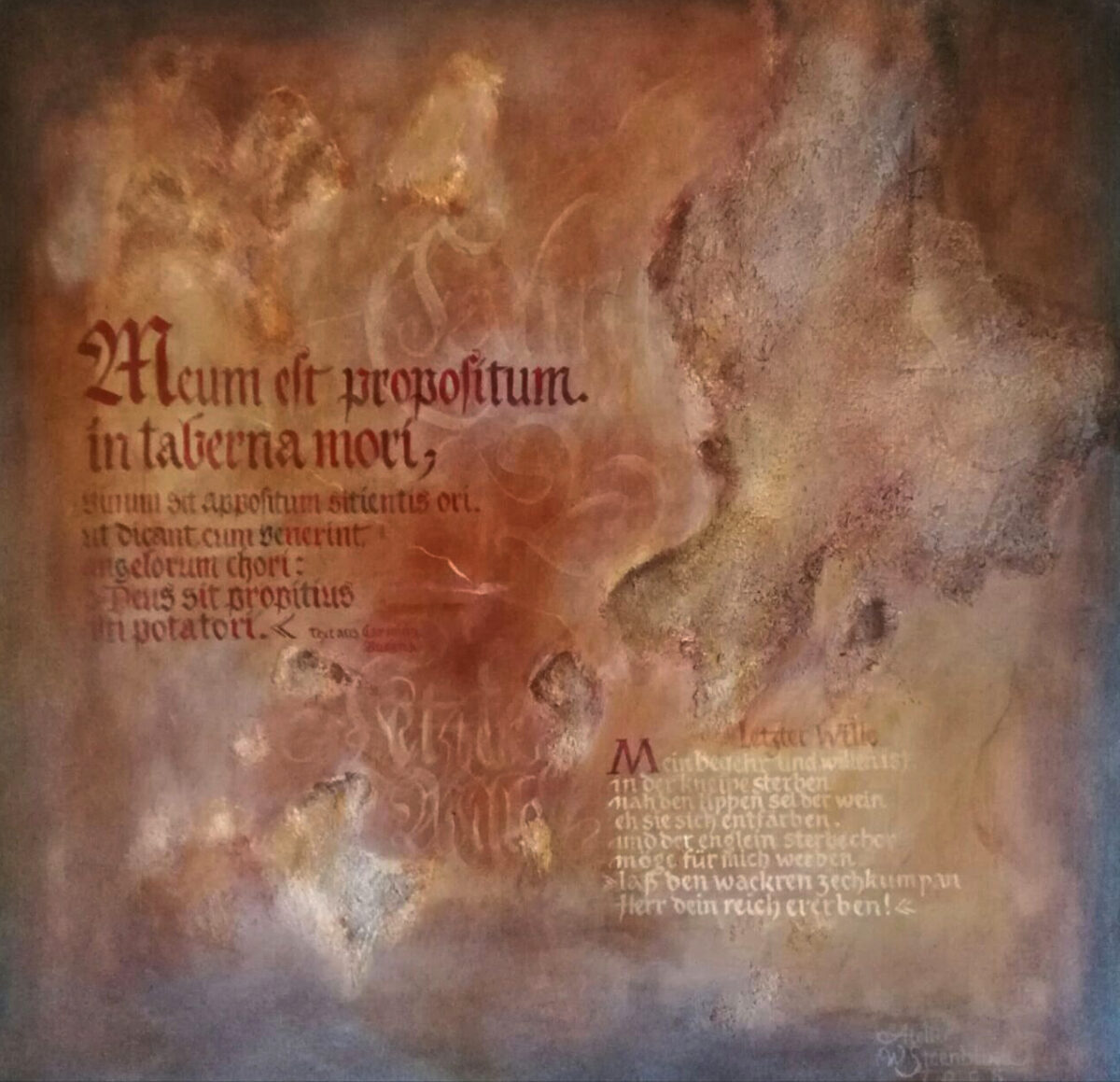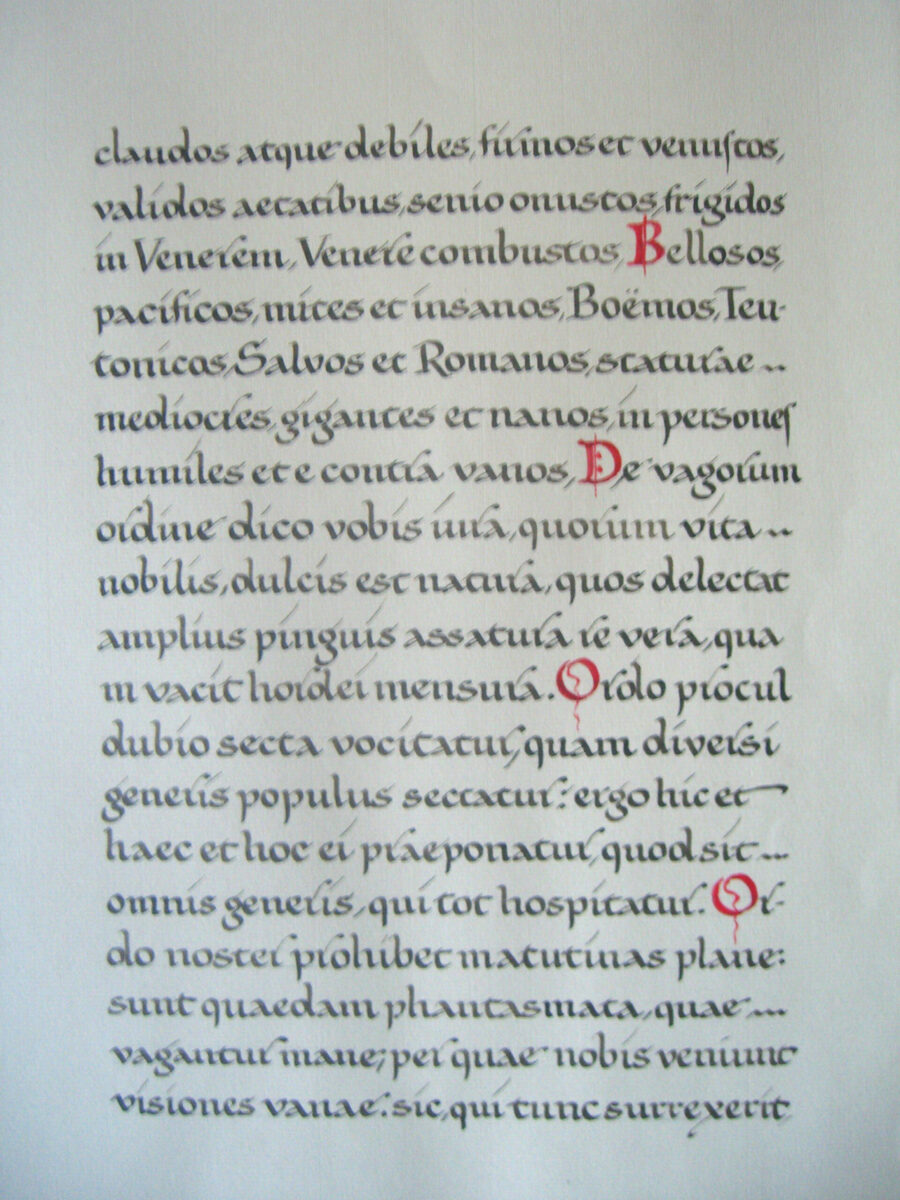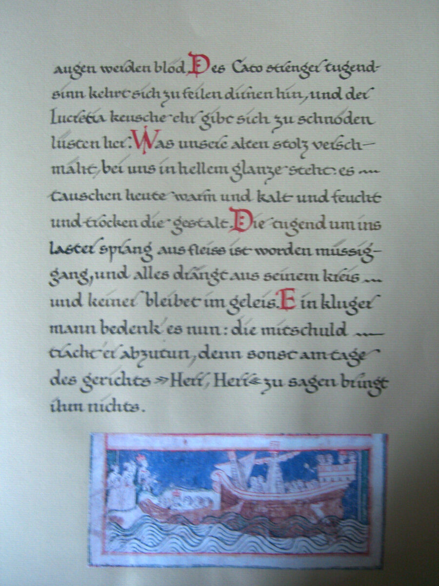 Der Inhalt dieser Texte hat Walter Steenblock so begeistert, dass er begann, den Text mit Federkiel und Tinte in Karolingischer Minuskel abzuschreiben. Über zweieinhalb Jahre hinweg entstand ein Unikat in der Größe 35×50 cm – eine  Arbeit in der Tradition mittelalterlicher Kopierkunst, die zwar wohl nie in Ausstellungen zu sehen sein wird, aber unbedingt sehenswert ist.