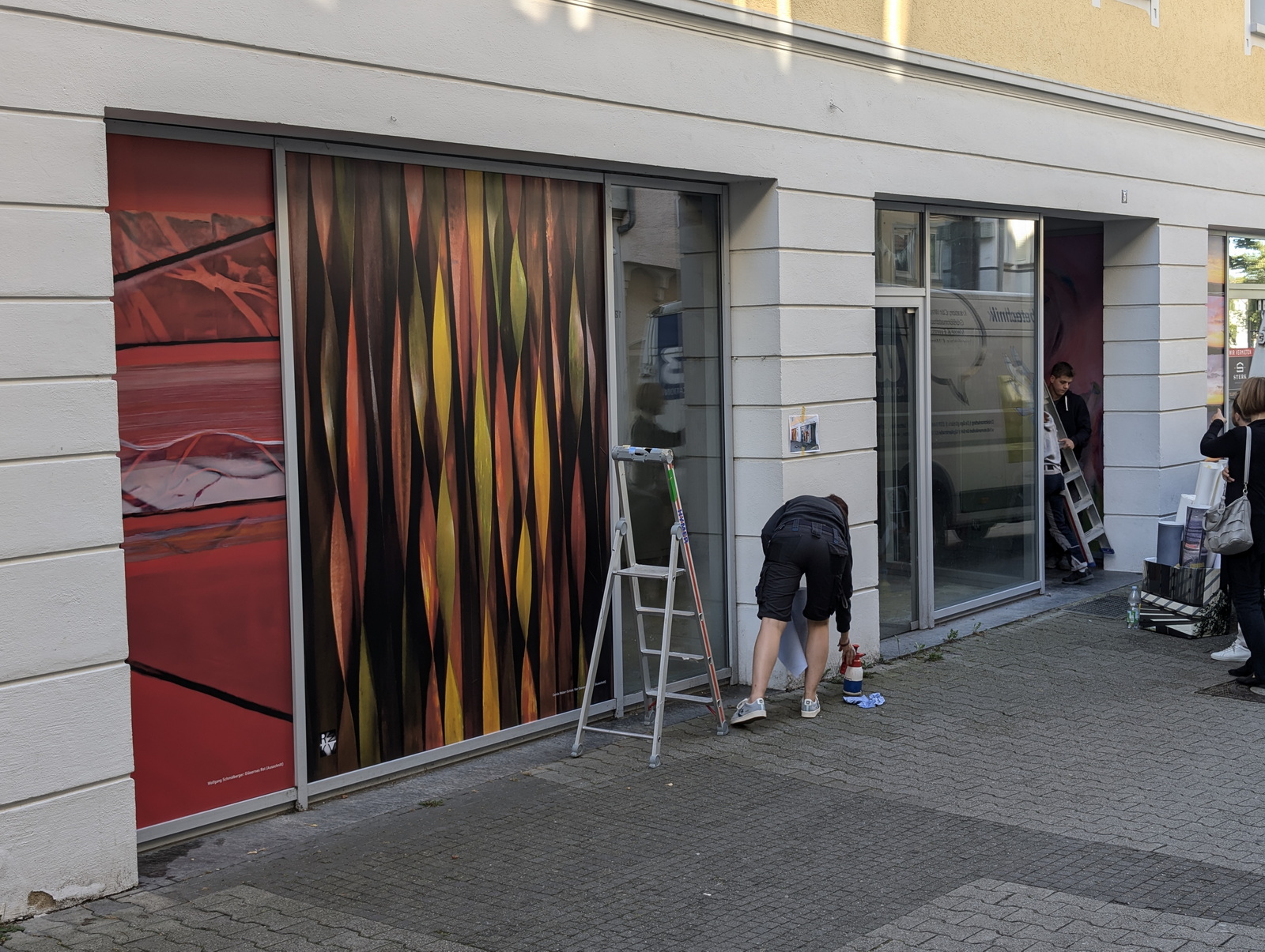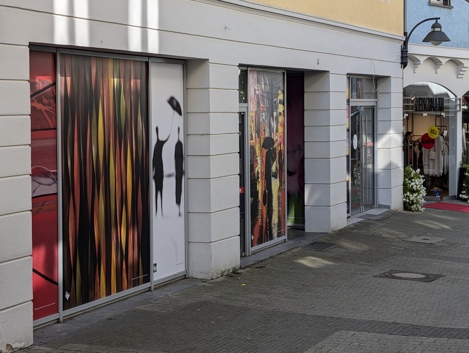 Dieser hat eine Reihe von vorhandenen Leerständen fotografiert und mittels einer Visualisierung gezeigt, wie die Fassaden der Geschäfte mittels einer Teilbeklebung der Fenster mit Folien bunter und attraktiver wirken. Dargestellt werden auf den Folien Werke von Vereinsmitgliedern. Der Clou: Es sind Ausschnitte von Werken, die eine Fensterfläche füllen. Das macht neugierig und lässt der Fantasie freien Lauf, wie wohl das gesamte Werk aussehen könnte. Freigelassene Fenster erlauben weiterhin Blicke ins Ladeninnere, um potenziellen Mietern Einblicke in die Gewerbeimmobilie zu ermöglichen.