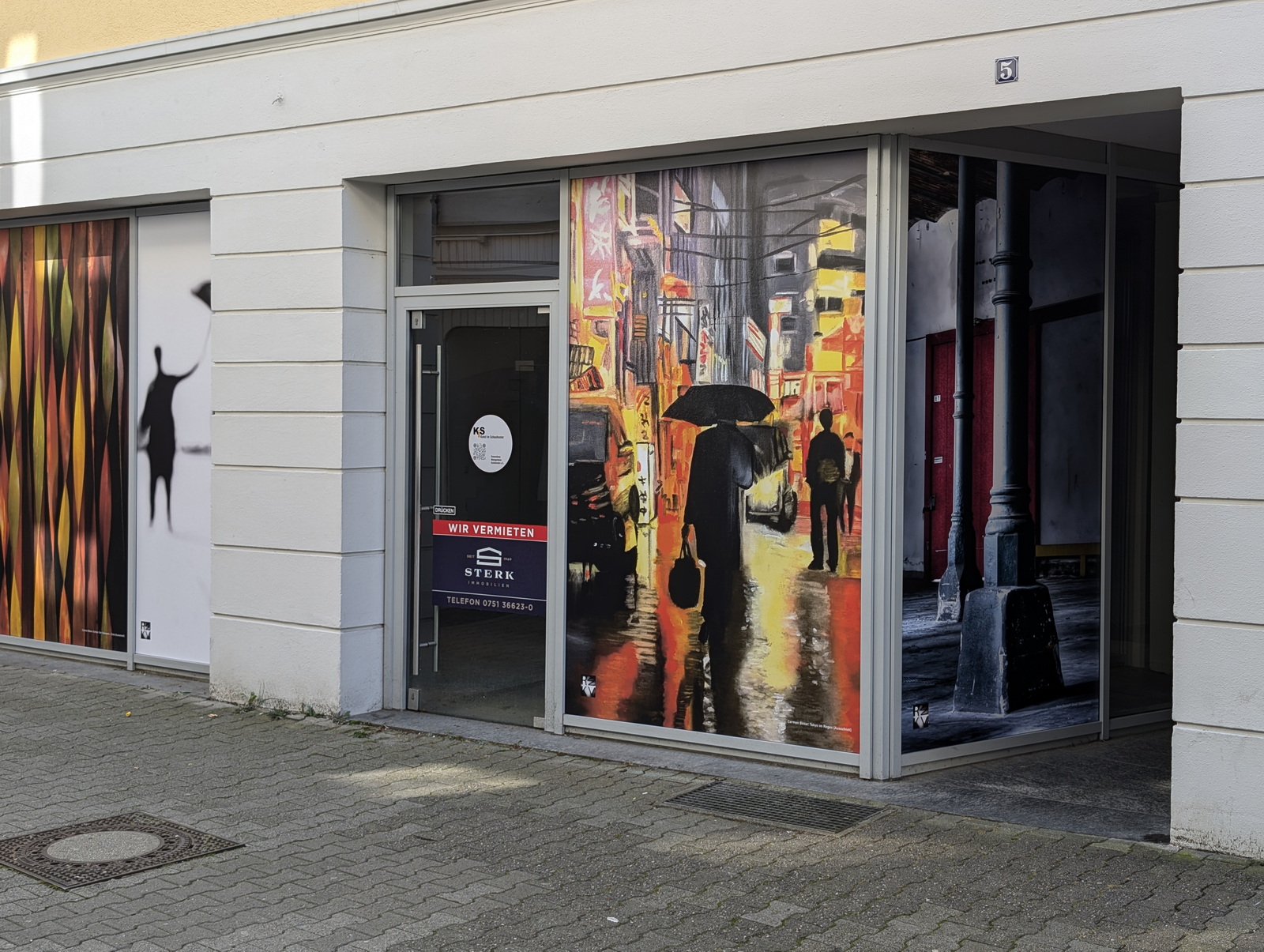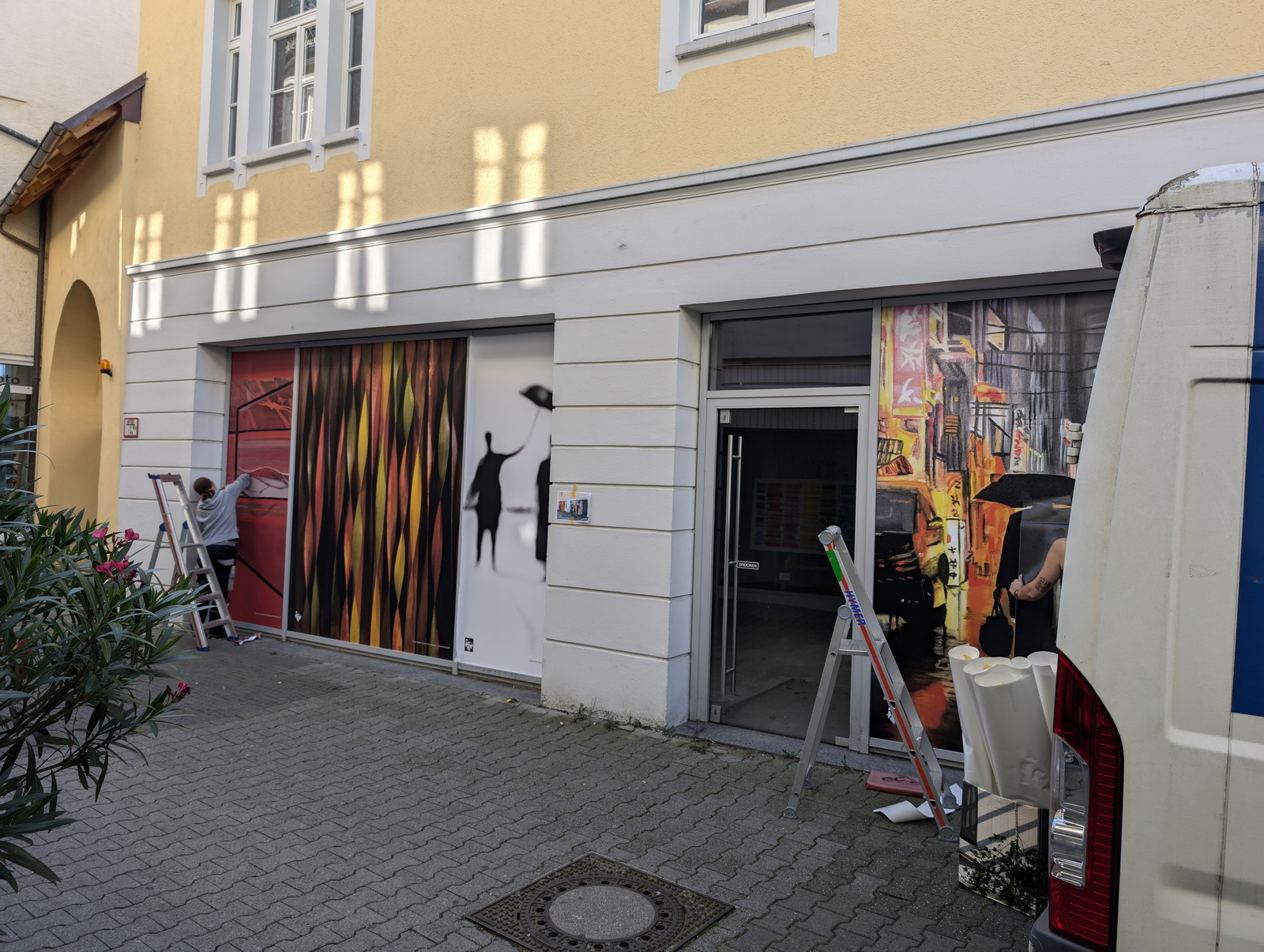 Die Vorteile dieser Beklebungsart liegen auf der Hand: Die Folien sind schnell montiert und wieder rückstandslos zu entfernen, stehen einem Umbau im Inneren nicht im Wege, sind flexibel anpassbar, relativ kostengünstig und werten das Objekt und das urbane Umfeld sichtbar auf. Die Bilder und Farben wecken Interesse und positive Emotionen. Sogar als Selfie-Point taugen die Motive. Regionalen Kunstschaffenden wird dazu eine Plattform der Präsentation gegeben. In diesem Fall den sechs Malerinnen und Malern, Fotografen, und Papierkünstlerinnen Wolfgang Schmidberger, Werner Seeberger, Carmen Bihler, Anne Claire Schroeder-Rose, Ernst Pini, Peter Bischoff und Carola Weber-Schlak.