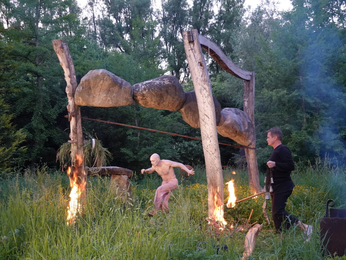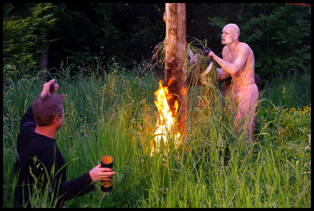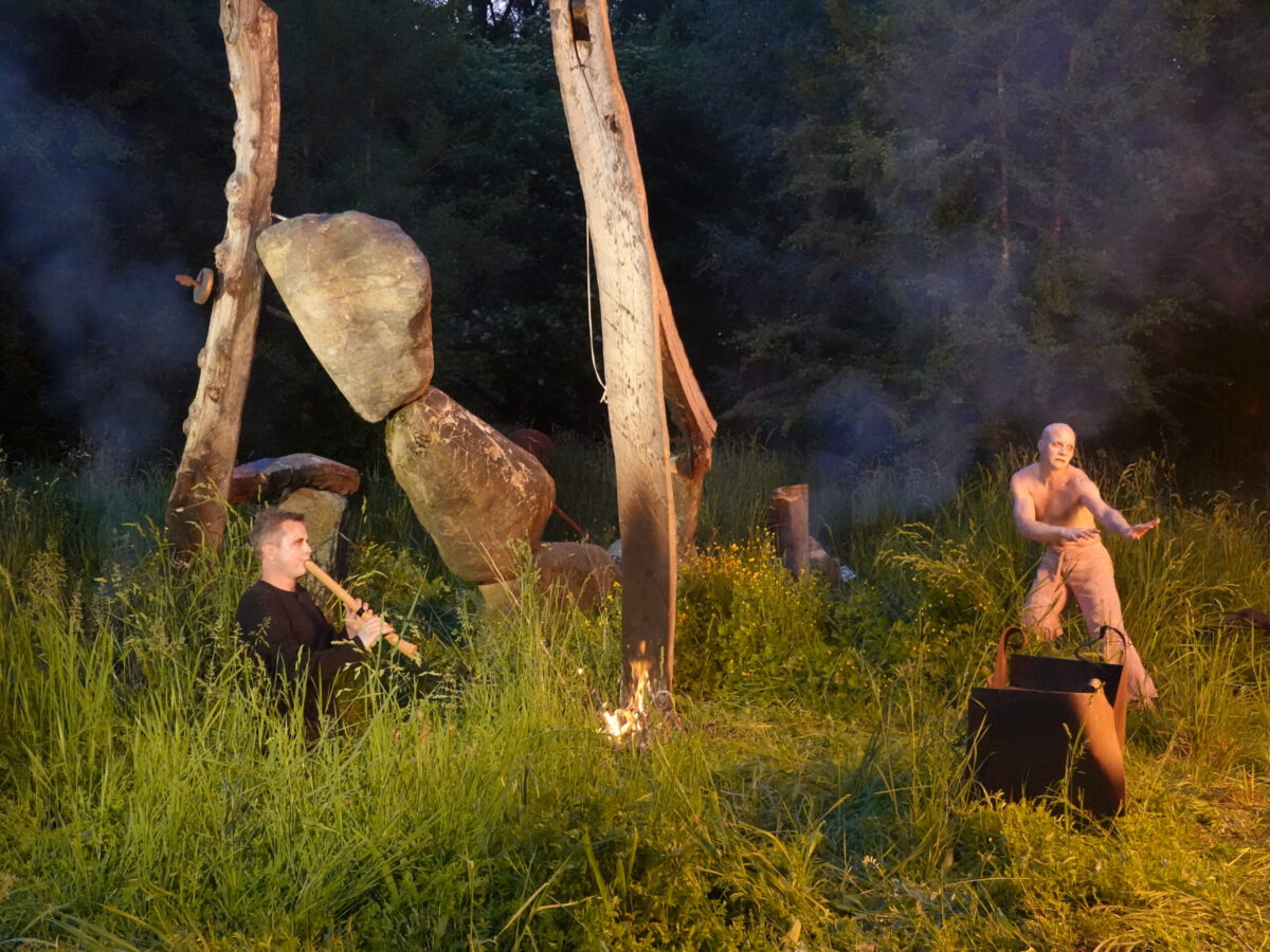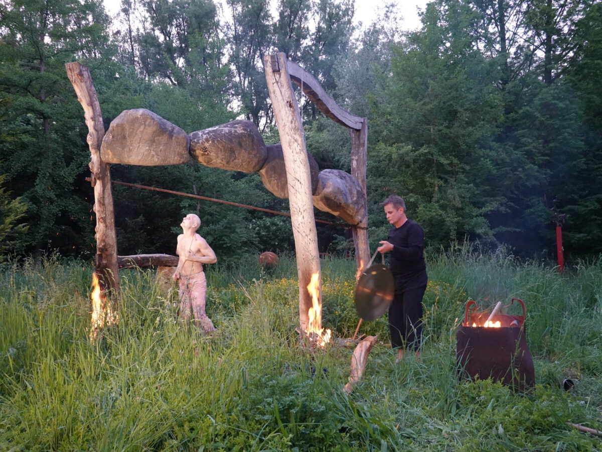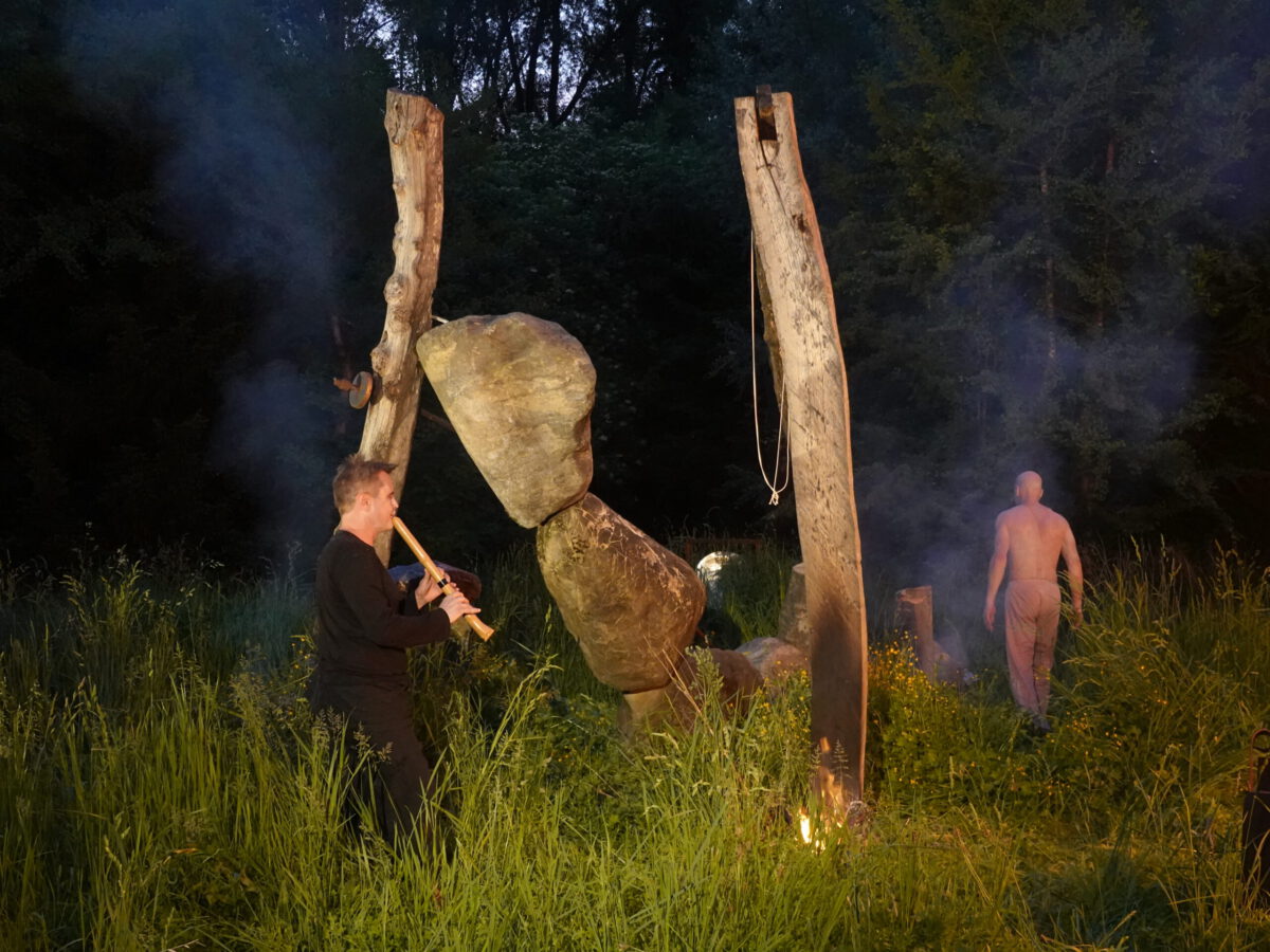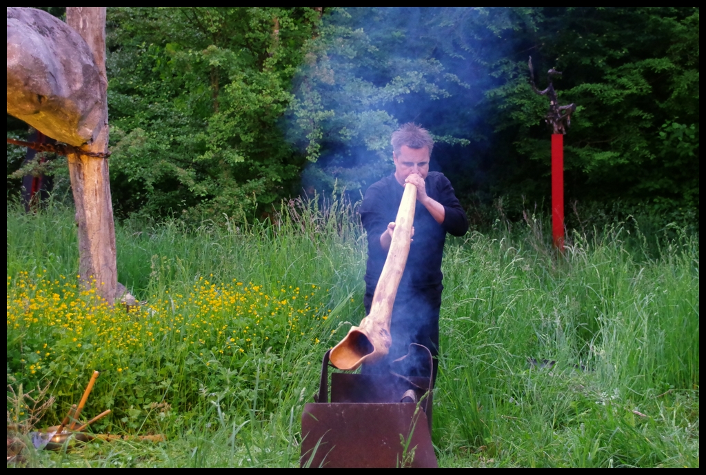 Wie schon zur Einweihung 2012 führte das Performance-Duo KYOSAI die Performance durch. KYOSAI, das sind Falco Jahn (Tanz/ Butoh) und Viz Michael Kremietz (Shakuhachi/Klanginstallationen)