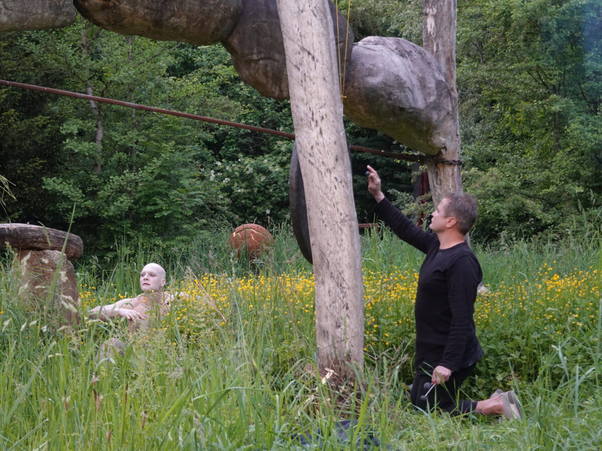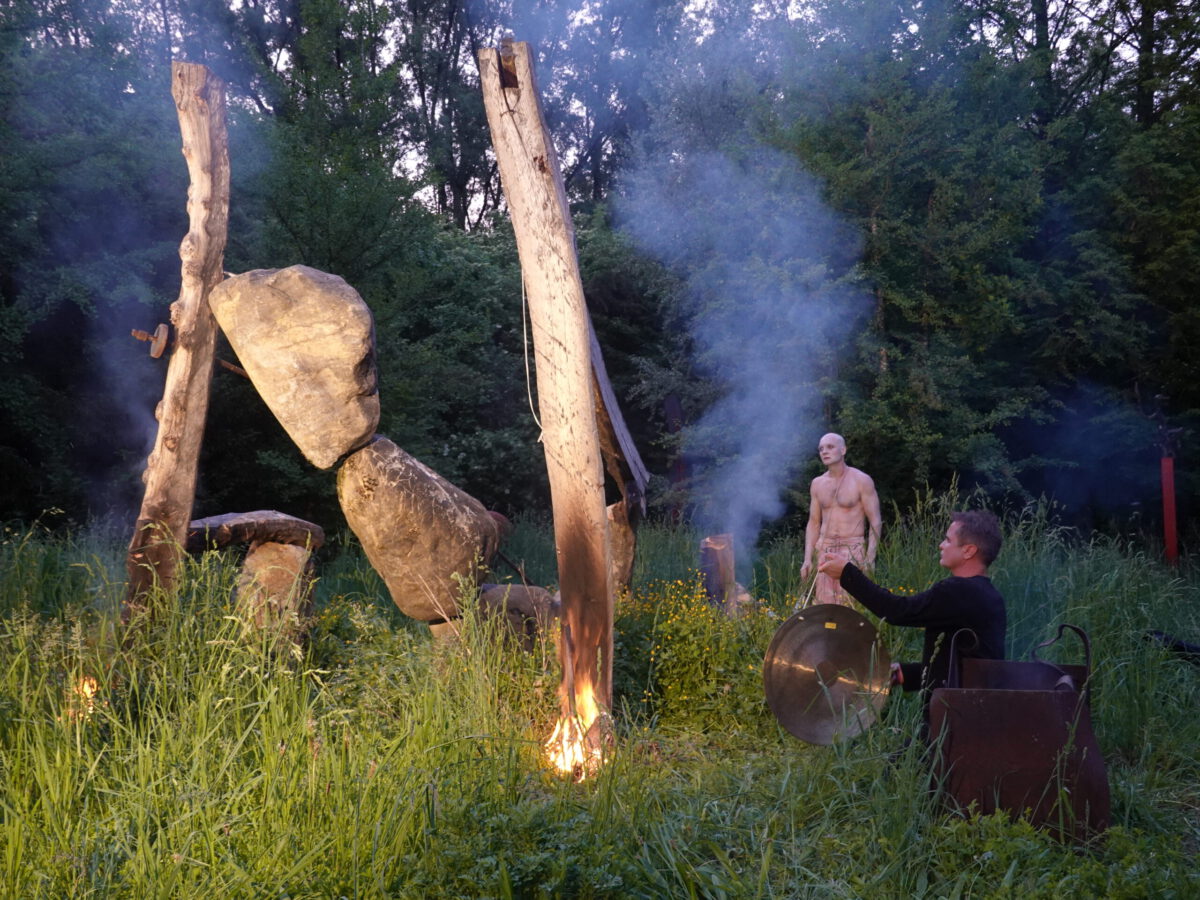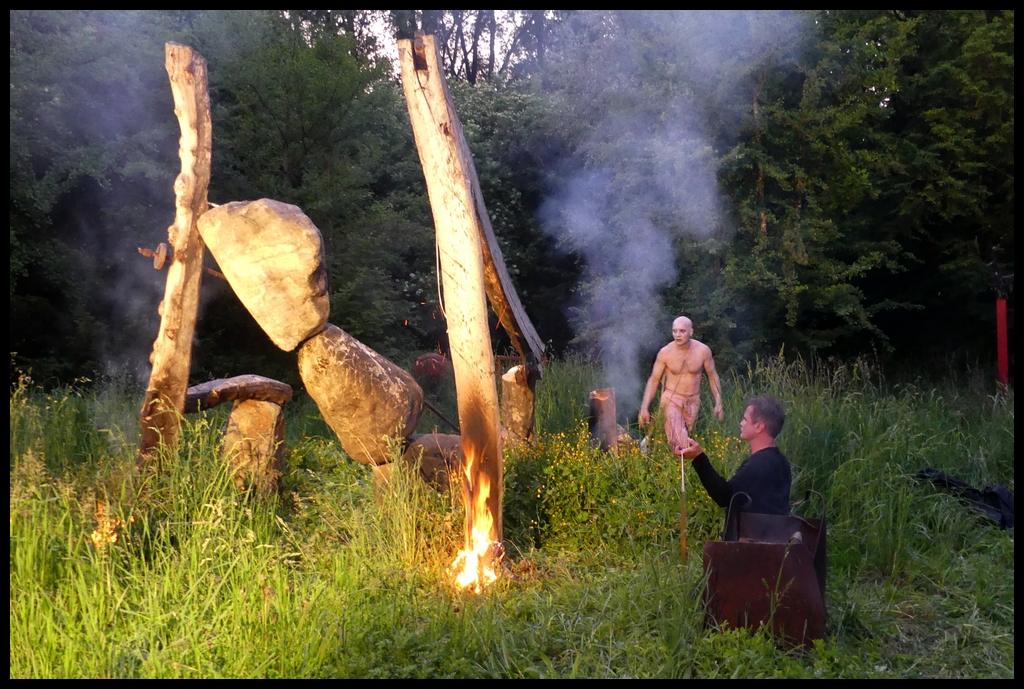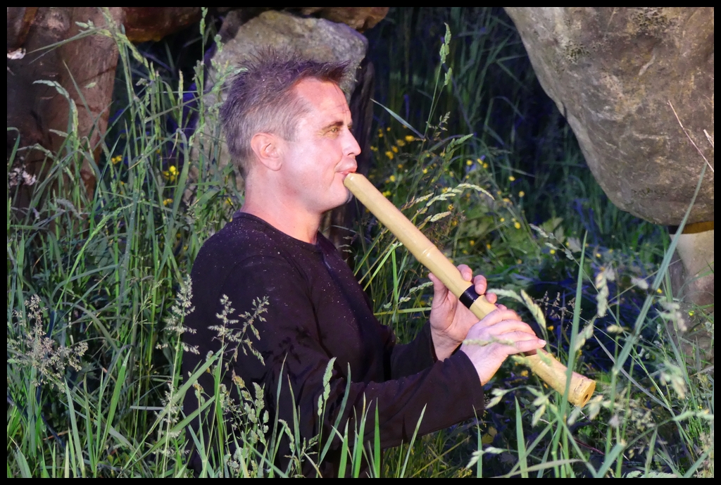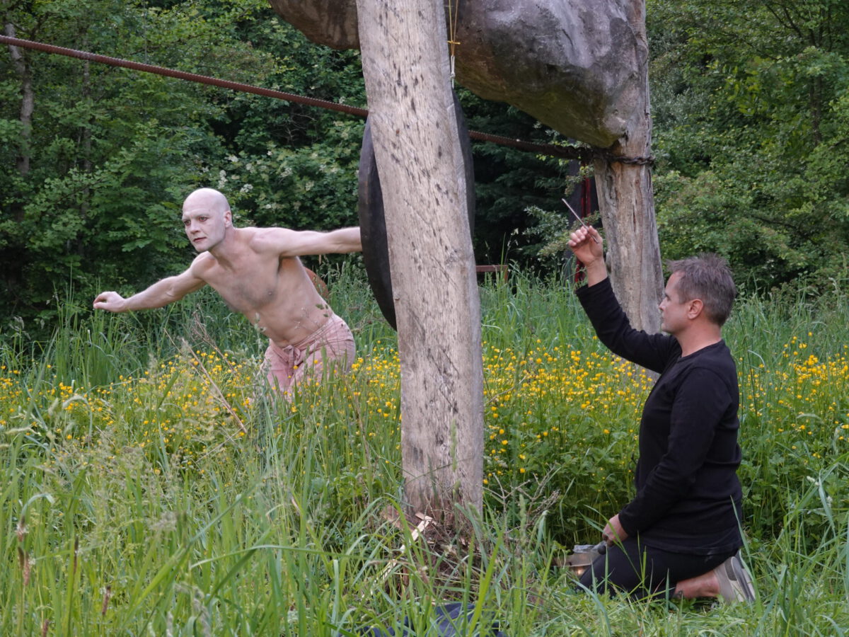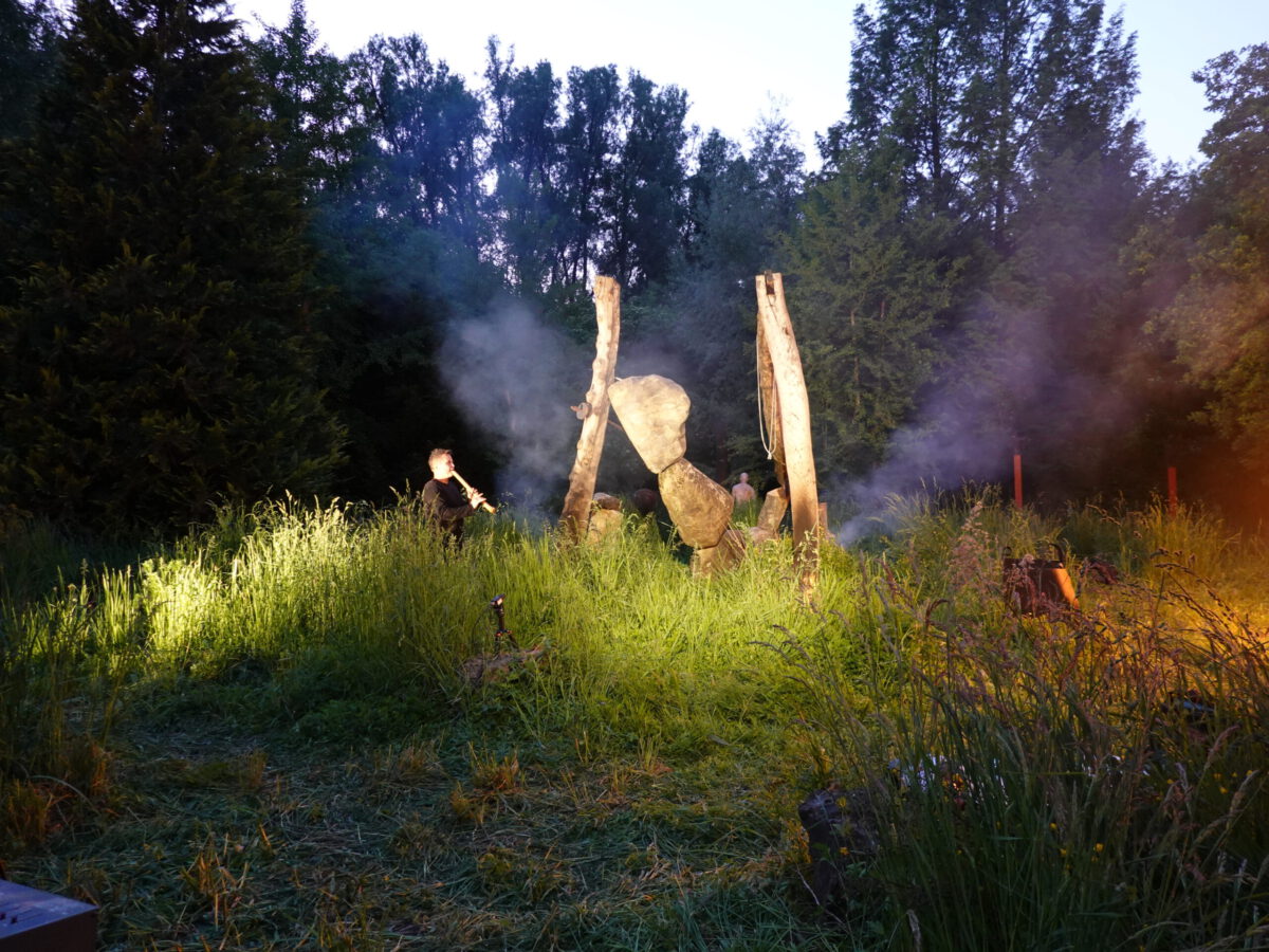 Wie schon zur Einweihung 2012 führte das Performance-Duo KYOSAI die Performance durch. KYOSAI, das sind Falco Jahn (Tanz/ Butoh) und Viz Michael Kremietz (Shakuhachi/Klanginstallationen)
