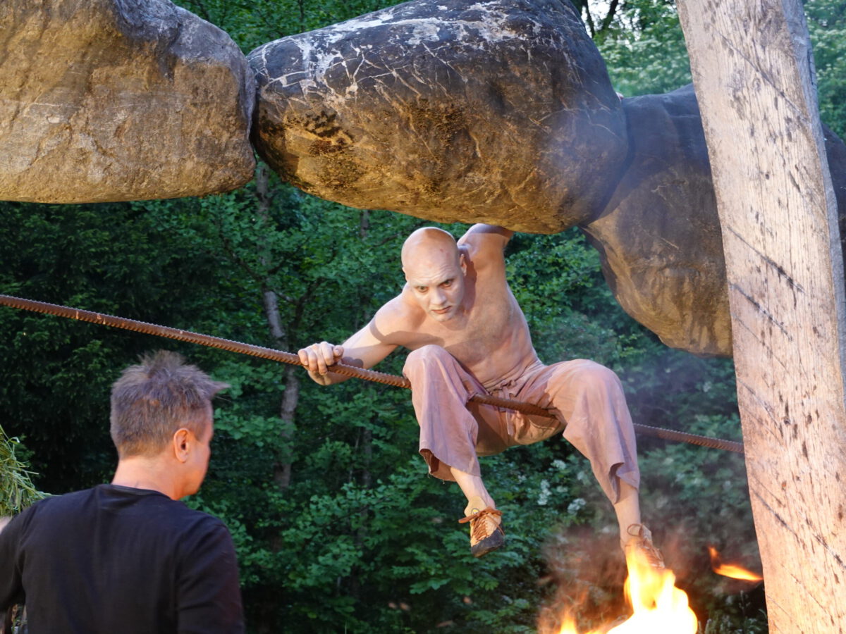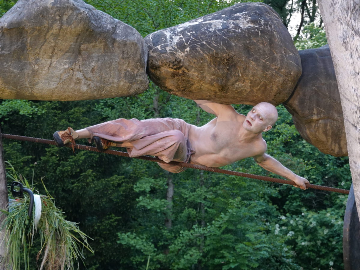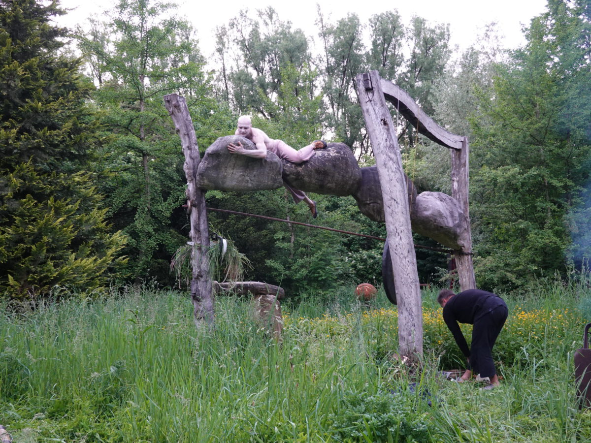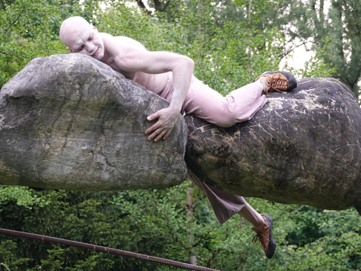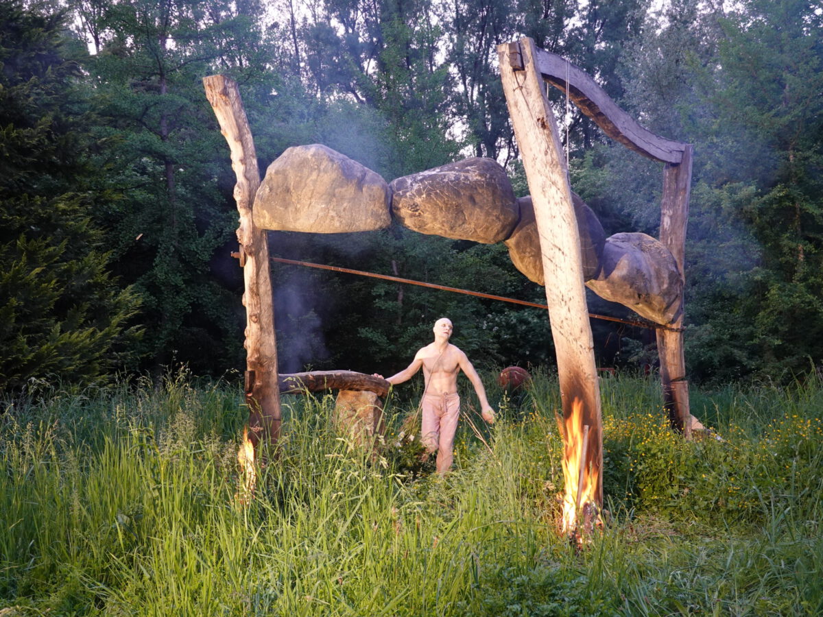 Er erbaute eine spektakuläre Skulptur: INNENAUSSEN, bei der vier Steine à 500 Kilogramm in 2 Metern Höhe zwischen 2 Rubinienstämmen zu schweben scheinen.