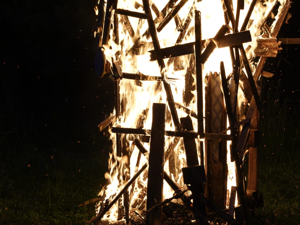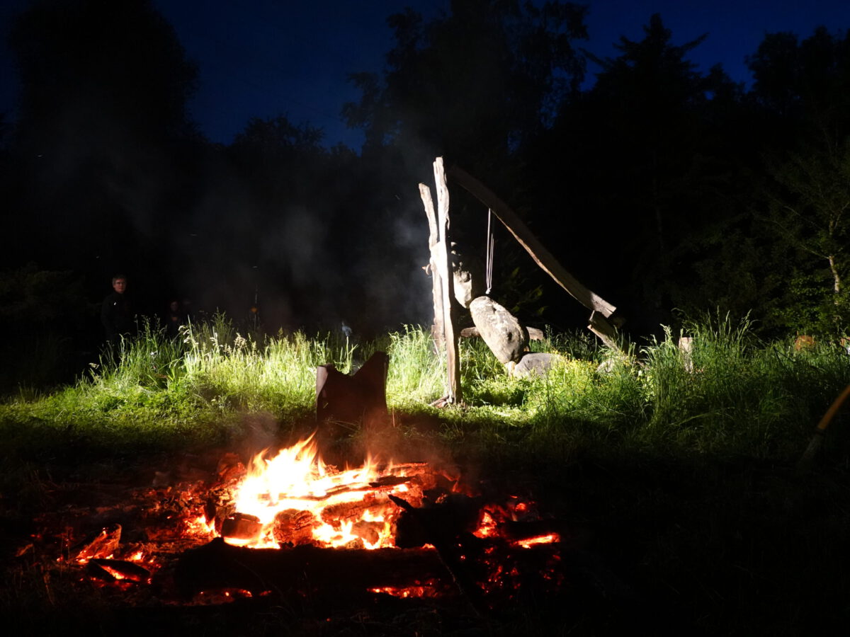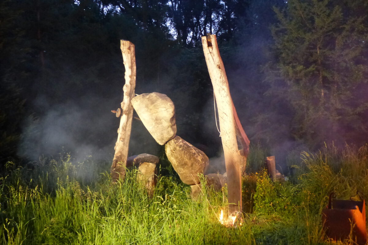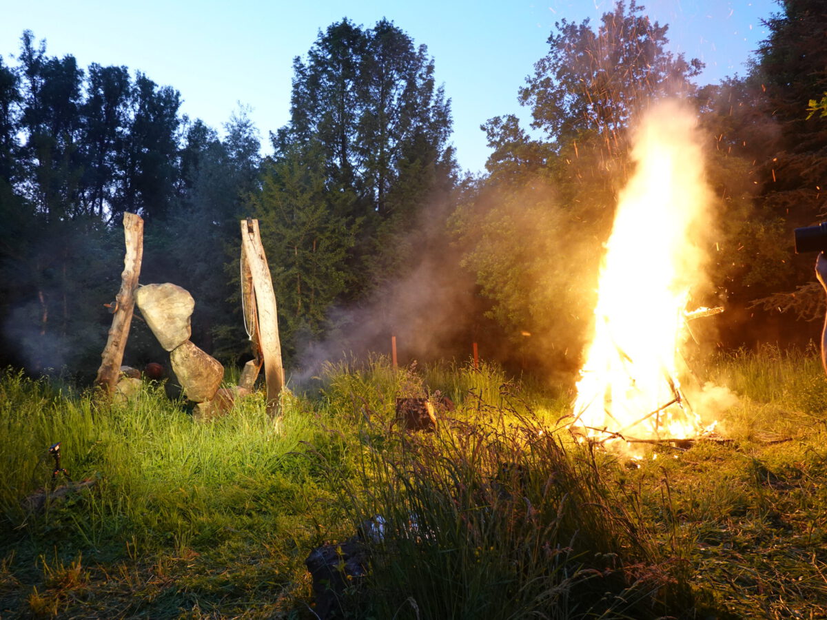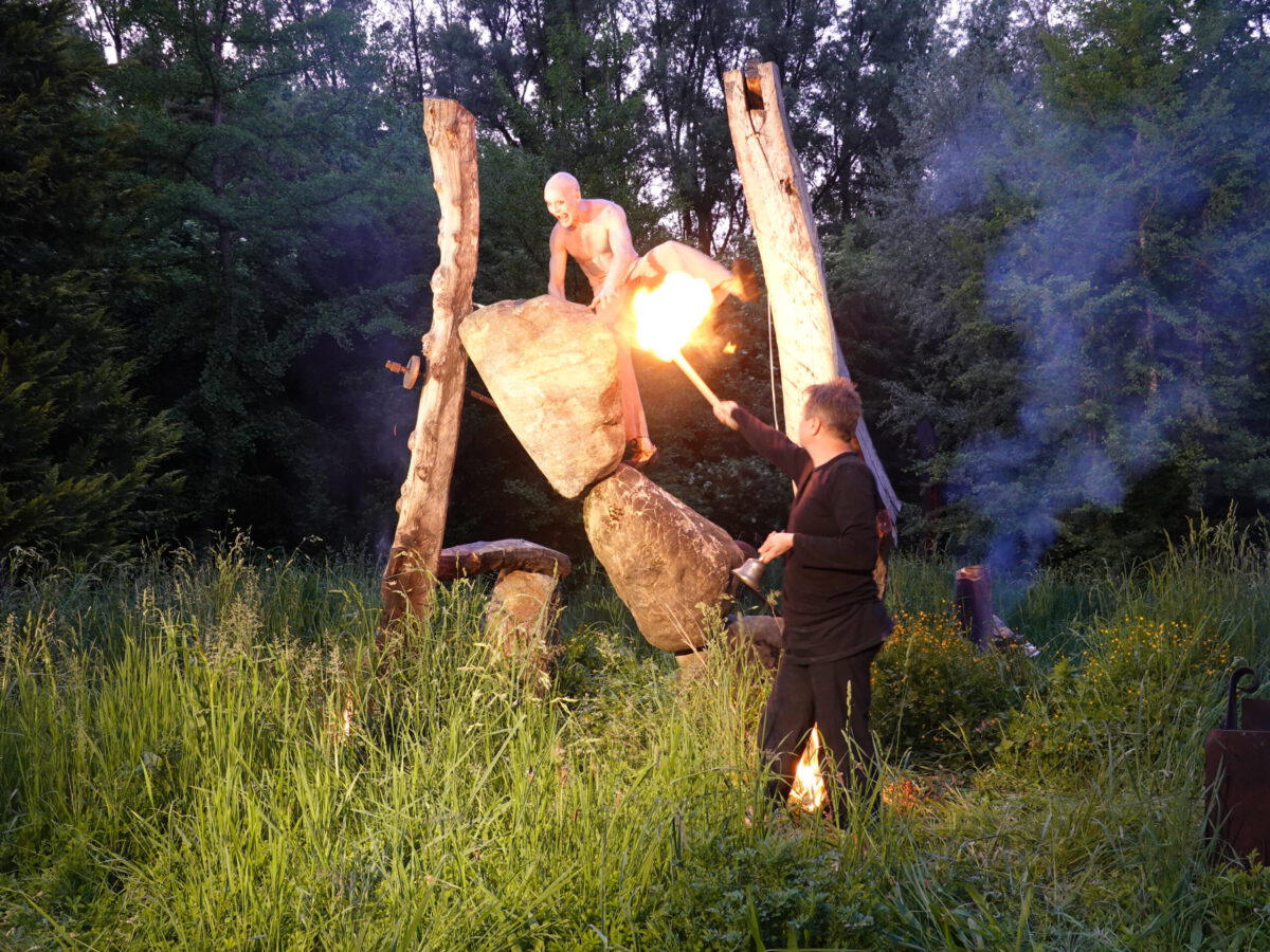 Durch Umgestaltungspläne der Gärtnerei muss nun dieser Skulpturenpark aufgelöst werden. Dazu wurde die Skulptur INNENAUSSEN von Falko Jahn in einer Performance am Samstag, 16.5.2020, ab 20:00 Uhr zu Fall gebracht.